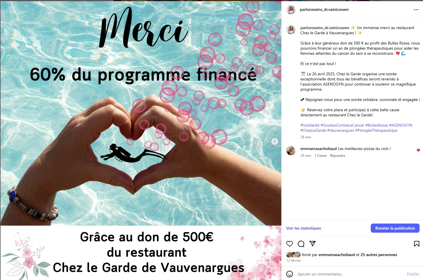 En octobre 2024, Le Docteur Véronique Vaini Cowen décide de lancer le programme « les bulles roses contre le cancer du sein », un programme de plongées thérapeutiques d’un an.